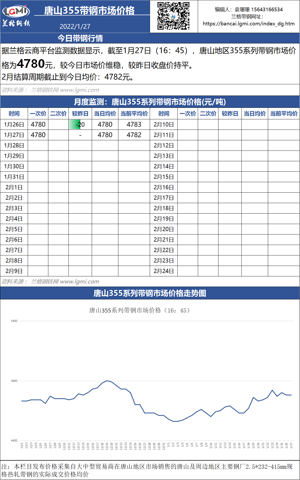 - 1月27日(16:45)唐山355系带钢市场价格2022/1/27