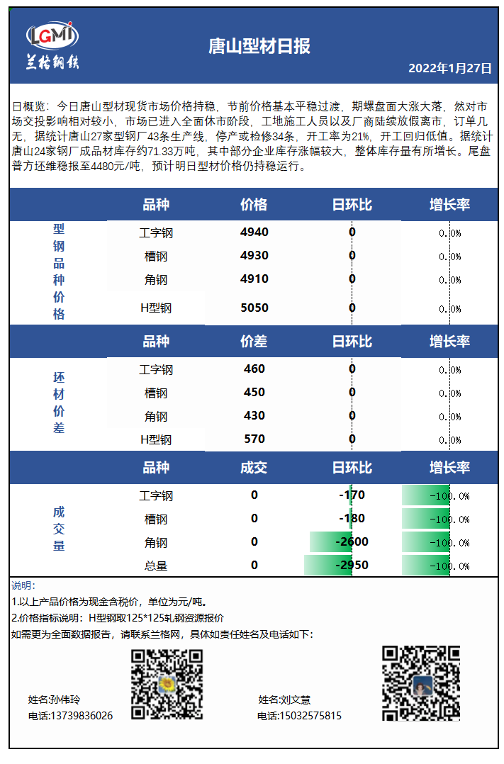 - 收评:今日唐山型材价格持稳,唐山地区基本进入休市状态,出货惨淡。2022/1/27