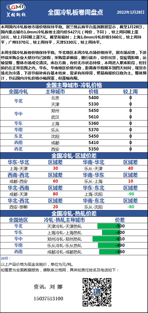 兰格冷轧板卷周盘点(1.28):冷轧价格保持平稳 预计节后小幅探涨