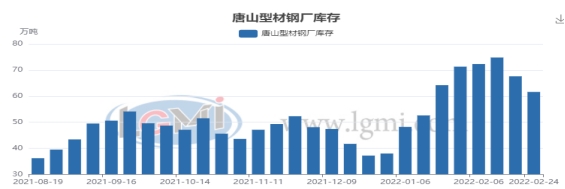 供应方面:目前处于采暖管控期间,常态化环保限产运行,冬奥会结束后短暂常态管控,或将迎来残奥会和两会期间管控措施,因此供应低位仍为近阶段供应主要特征,据调查目前轧线暂时生产正常,供应稳定,山西地区晋南钢铁预计3月初检修结束,长治钢铁预计3月1日开始检修,华北地区津西、鑫达均正常生产,山东地区供应基本稳定,莱钢一条轧线检修,其他均正常供应。唐山地区轧钢企业2月21号开始陆续复产,目前生产基本稳定,环保管控不定期发布临时管控措施。据调查截至2月24日统计唐山24家轧钢企业成品材库存约61.59万吨,较上月末降13.69%,与春节及冬奥期间停限产有关,2月下旬恢复生产后库存总量基本维持阶段性高位。