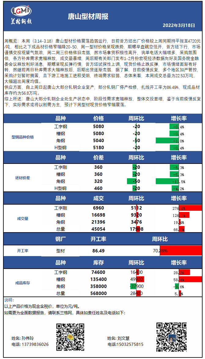 - 唐山型材周盘点:价格震荡趋弱 阶段性需求宽幅释放2022/3/18