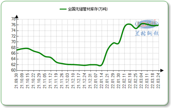 据兰格钢铁云商数据平台监测显示:国内23个城市无缝管社会库存总量75.93万吨,周环比增加0.27%,疫情影响下,终端需求骤减,无缝管资源在各级贸易商间流转。