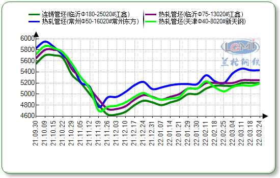 本周(3.21-3.25)国内无缝管价格小幅上调。上游管坯:新天钢累计上调60元,东方累计上调30元,现20#热轧管坯北方钢厂出厂报价5210-5300元(每吨,下同),南方钢厂出厂报价5420-5630元。20#连铸管坯出厂报价5150-5250元。北方主流民营管厂出厂累计上调30-60元,现中等普轧出厂报价5830-5980元,中等连轧出厂报价5920-6160元。本周市场普遍上调30-50元,个别资源上调100元。据兰格钢铁云商数据平台监测显示:国内十大主导城市108*4.5无缝管市场均价6295元,较上周上涨15元。