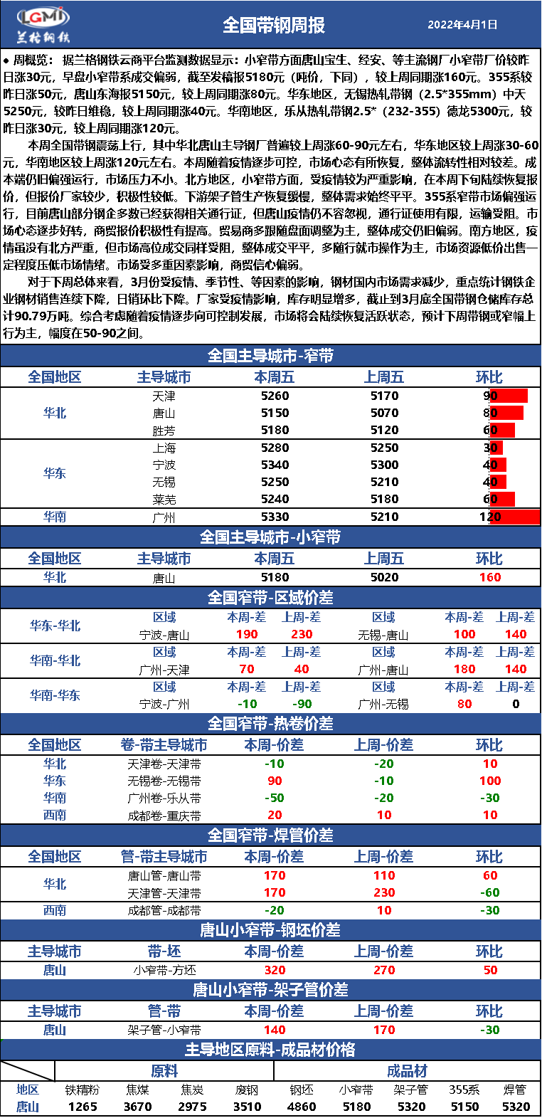 - 兰格带钢周盘点:带钢市场格震荡上行 市场信心逐步提升2022/4/1