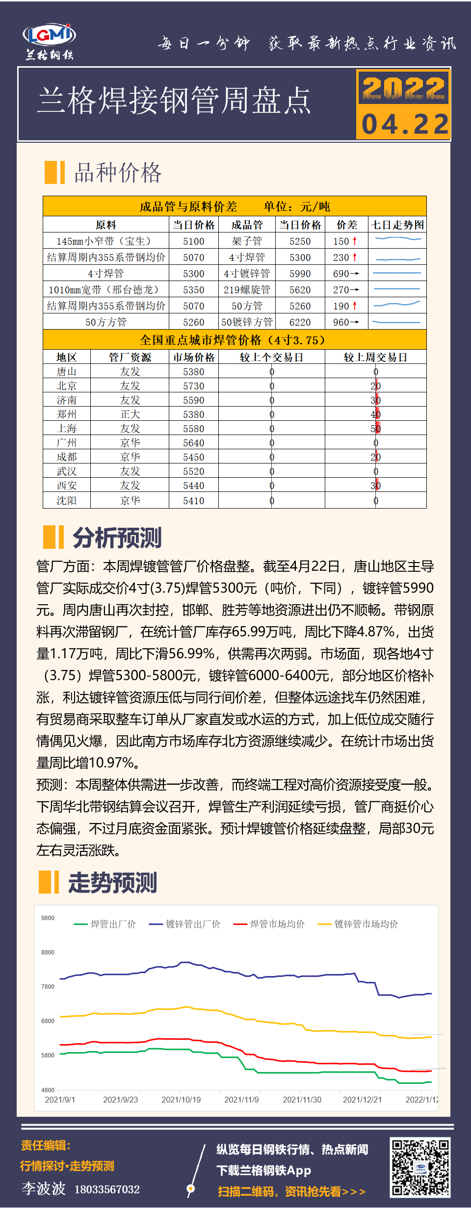 - 兰格焊管周盘点:价格盘整运行 供需逐步改善2022/4/22