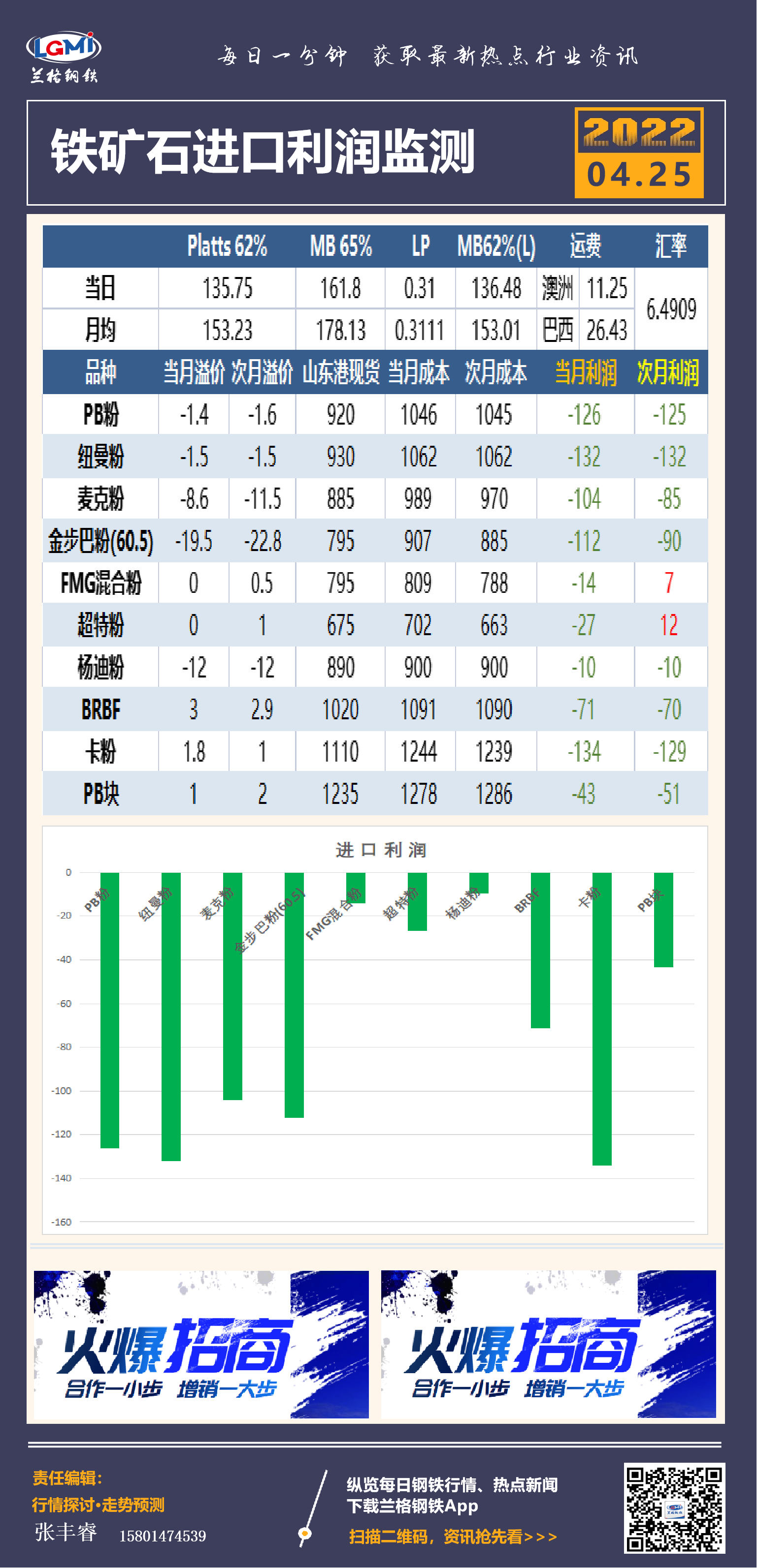 - 4月25日铁矿石现货进口利润监测2022/4/25