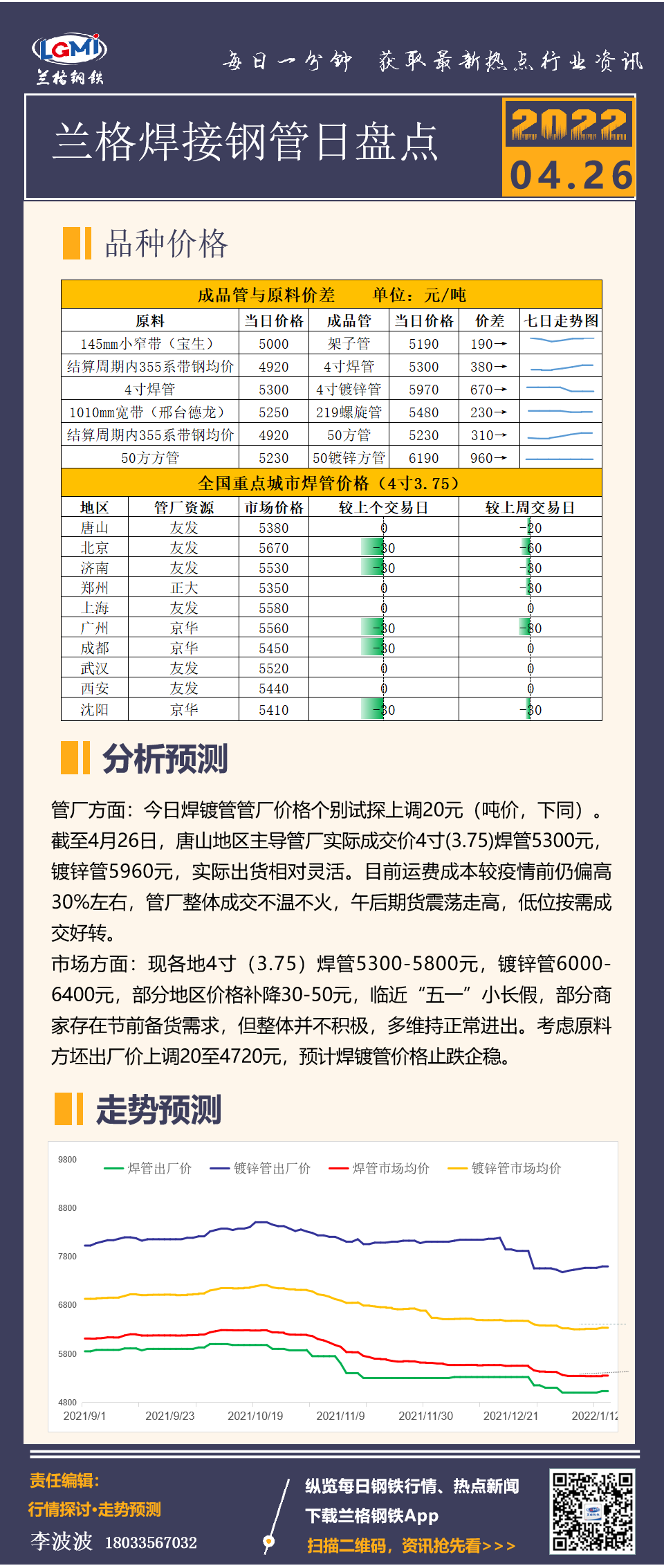 - 兰格焊管日盘点:原料继续调整 价格或延续下挫2022/4/25