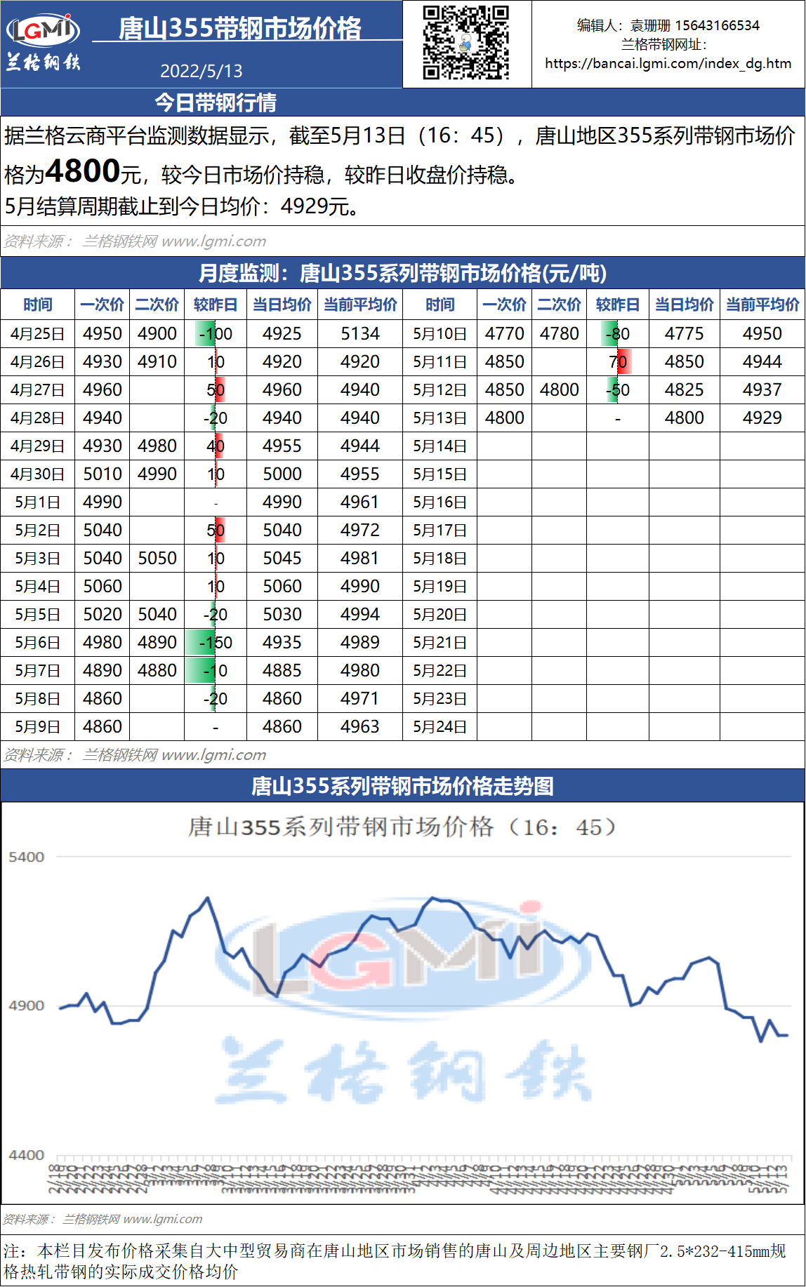 - 5月13日(16:45)唐山355系带钢市场价格2022/5/13