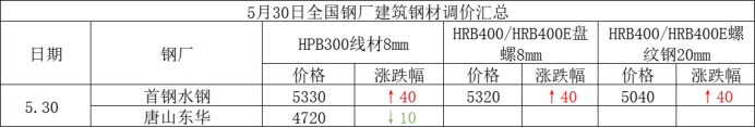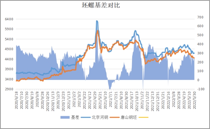 坯螺价差:以北京市场为例,5月30日河钢螺纹基价4700元与钢坯4450元基差为250元,较上个交易日扩大10元。