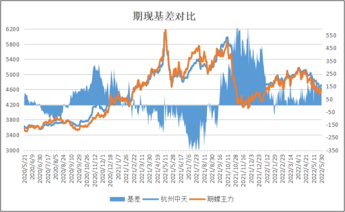 期现基差:以杭州市场为例,5月30日中天螺纹基价4720元与主力期螺收盘4621元基差为99元,较上个交易日收窄33元。