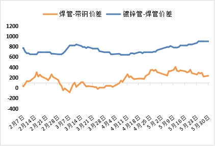 5月焊管较带钢价差由高位逐步收窄,结算周期内焊管厂平均利润13元,架子管月内平均亏损51元;镀锌管较焊管价差有所走扩。5月焊镀管厂综合生产利润得以改善。