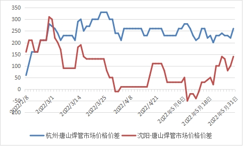 图3 2022年唐山-杭州焊管、沈阳-唐山价差走势图