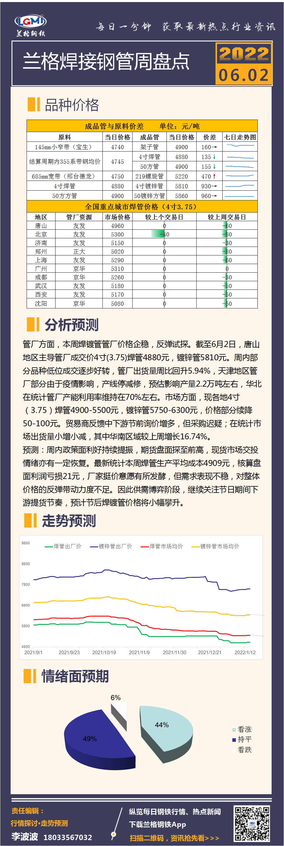 - 兰格焊管周盘点:需求谨慎放量 节后价格或小幅攀升2022/6/2