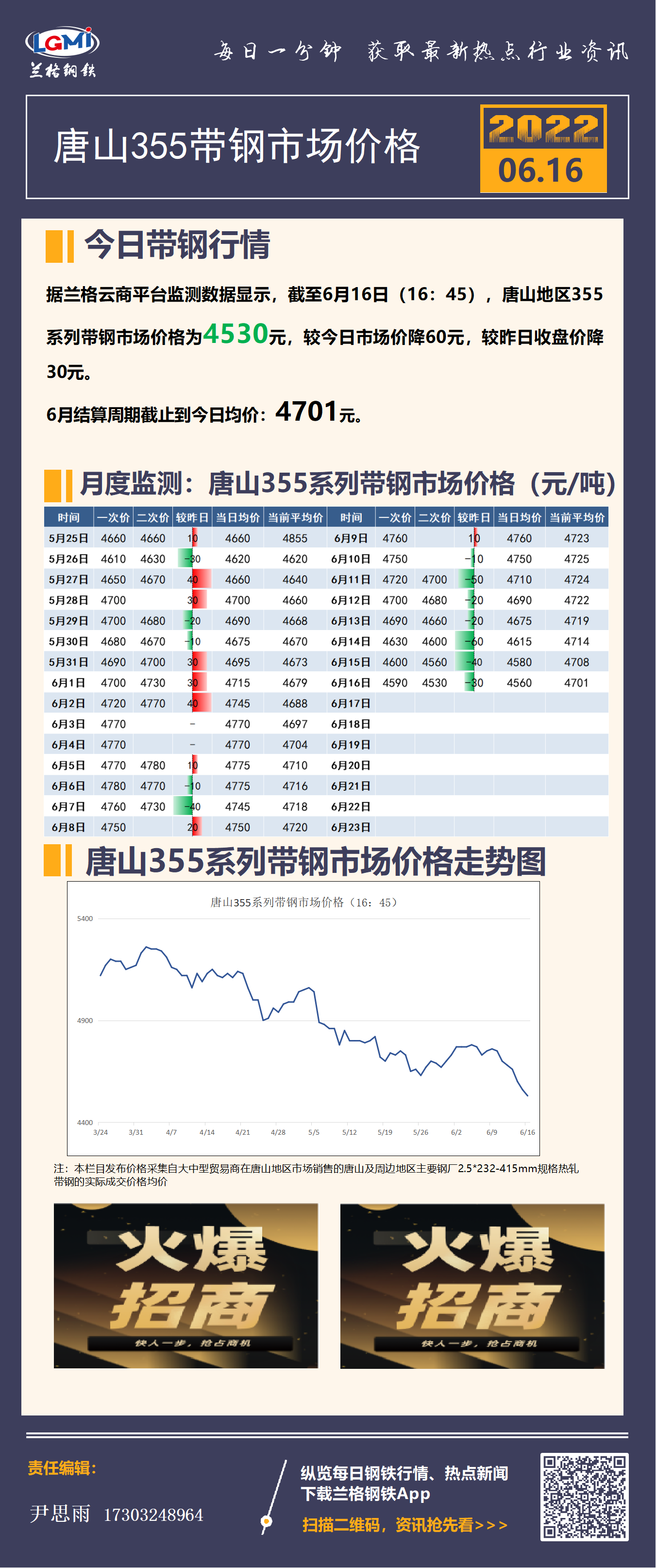 6月16日(16:45)唐山355系带钢市场价格