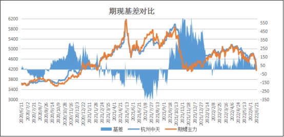 期现基差:以杭州市场为例,6月21日中天螺纹基价4280元与主力期螺收盘4224元基差为56元,较上个交易日扩大5元。