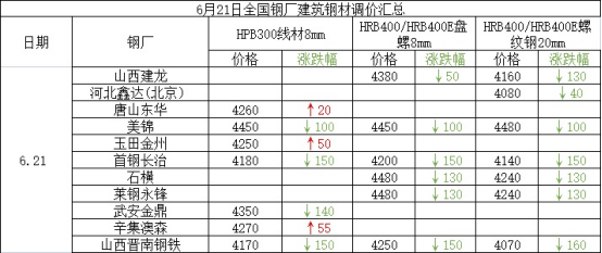 - 6月21日中天钢铁集团品种线材价格下调350元2022/6/21