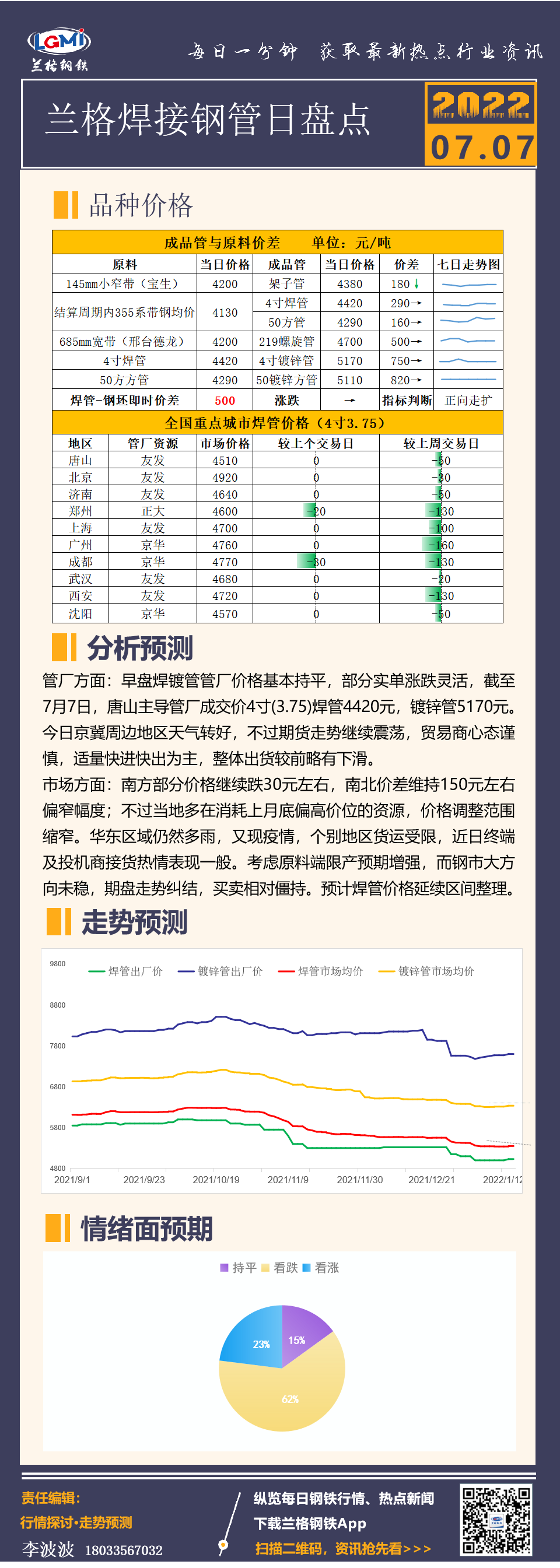 - 兰格焊管日盘点:需求持续谨慎 价格涨跌僵持2022/7/7