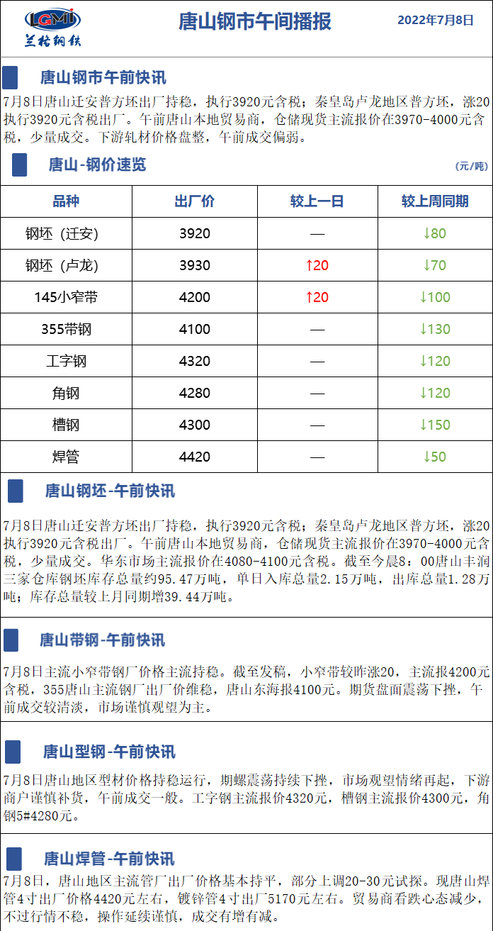 - 7月8日唐山津西钢铁带钢出厂价格维稳2022/7/8