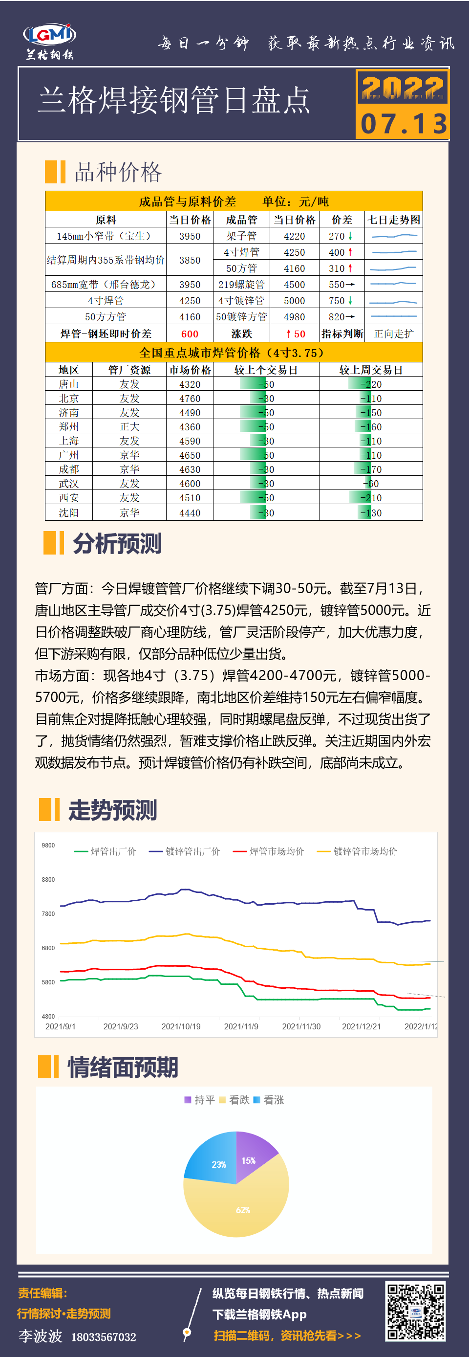 - 兰格焊管日盘点:期螺尾盘反弹 现货仍跌 跌势有望收窄2022/7/13