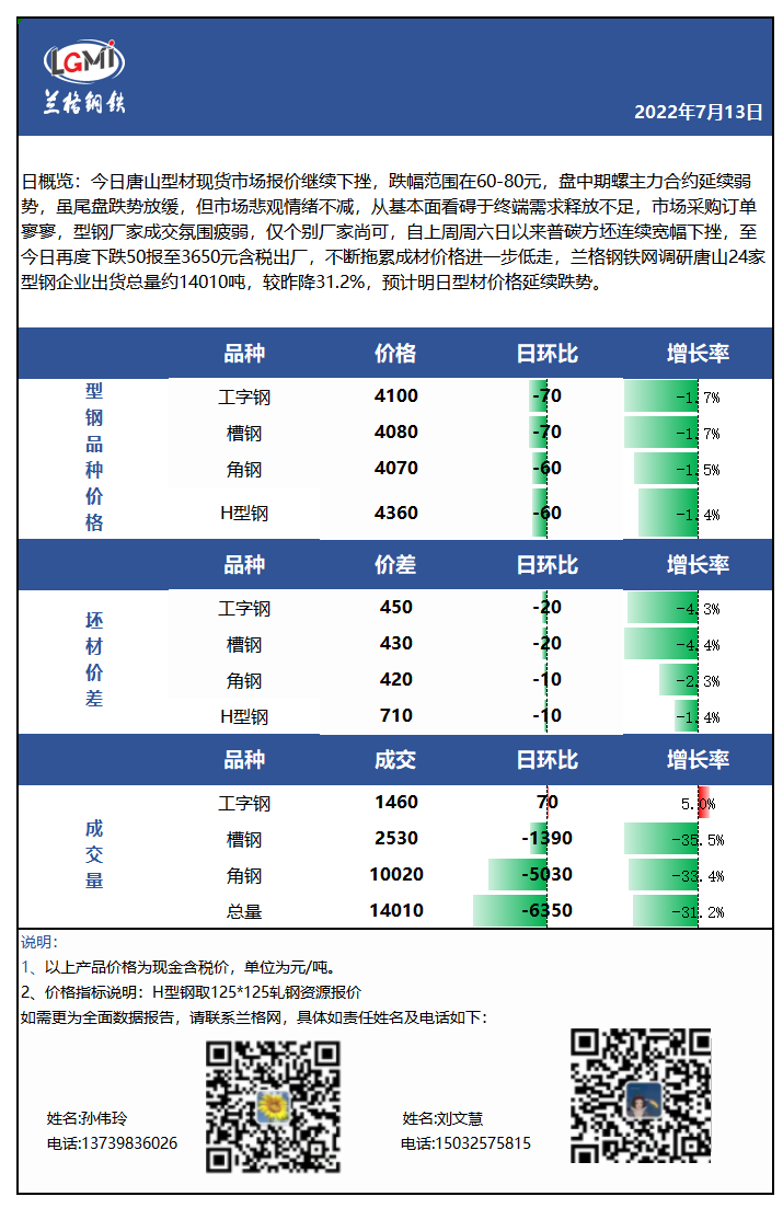 - 唐山型材日盘点:价格继续下挫 市场成交明显较弱2022/7/13