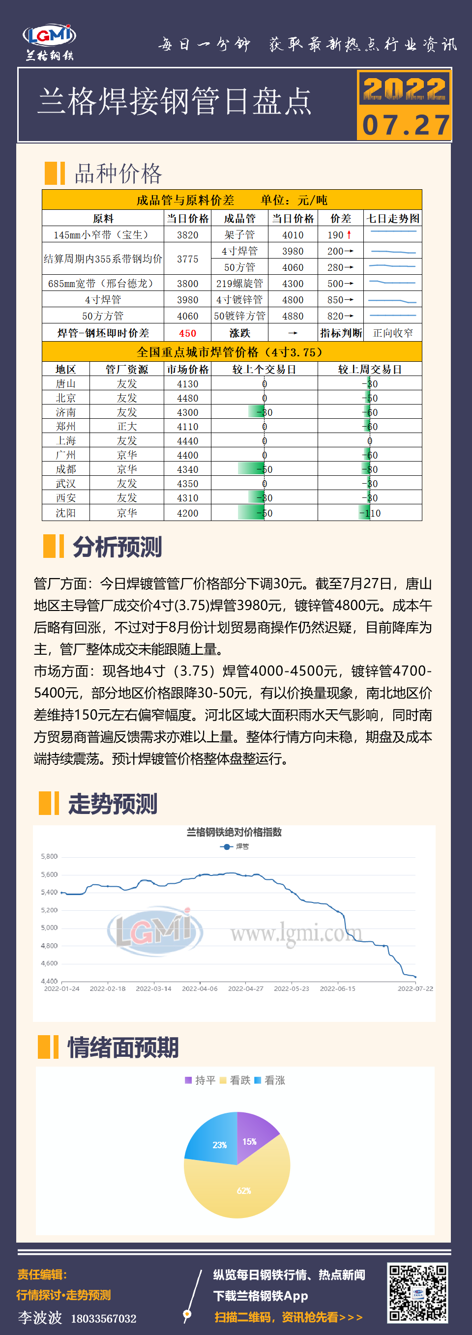 - 兰格焊管日盘点:低价换量 焊镀管厂商静待方向明朗2022/7/26