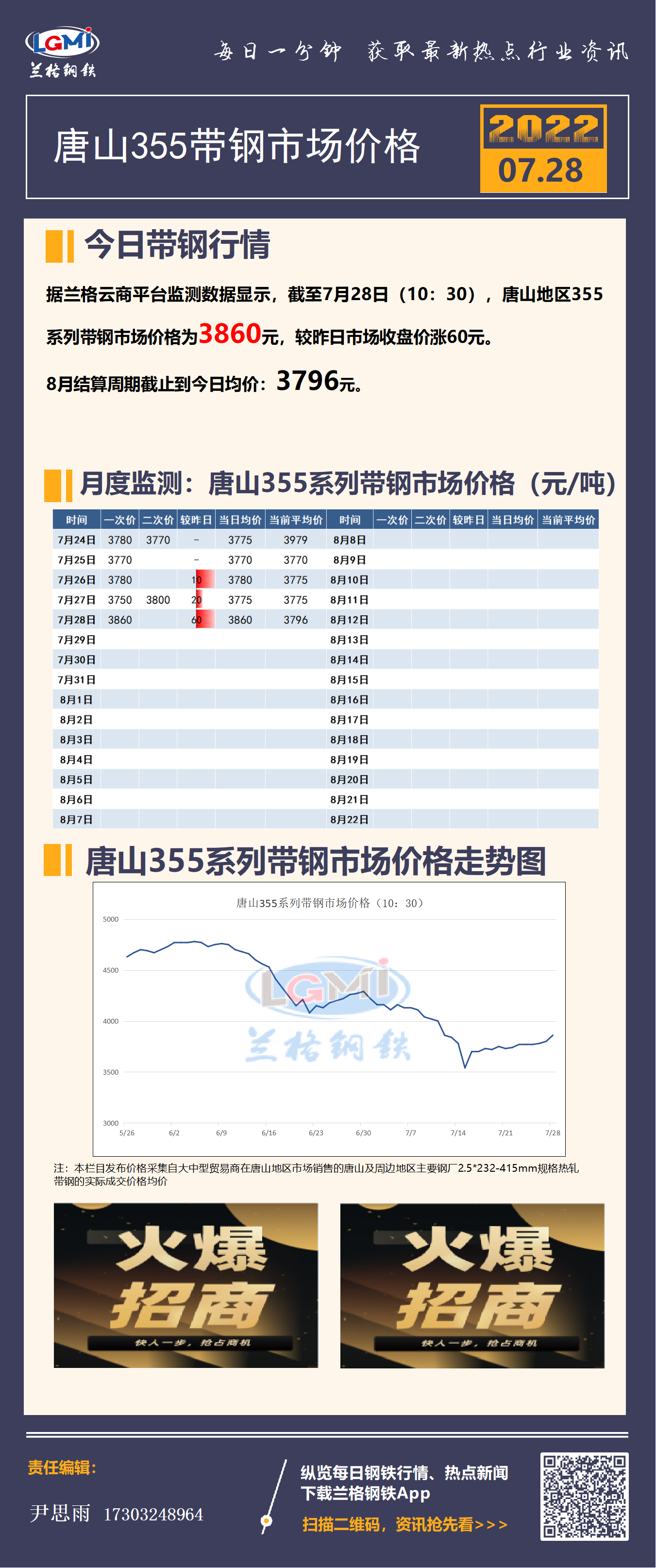 - 7月28日(10:30)唐山355系带钢市场价格2022/7/28