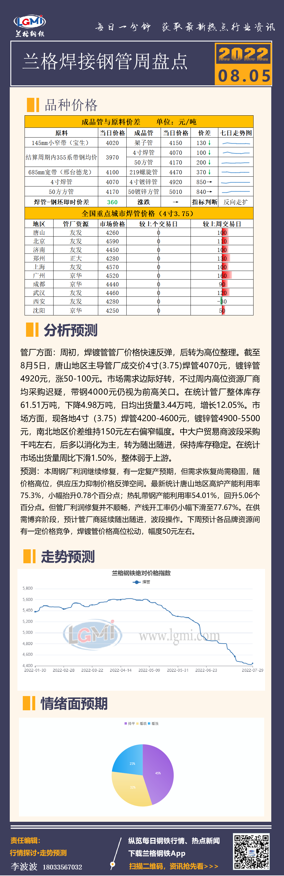 - 兰格焊管周盘点:进入高位调整期 焊镀管进出延续风控2022/8/5