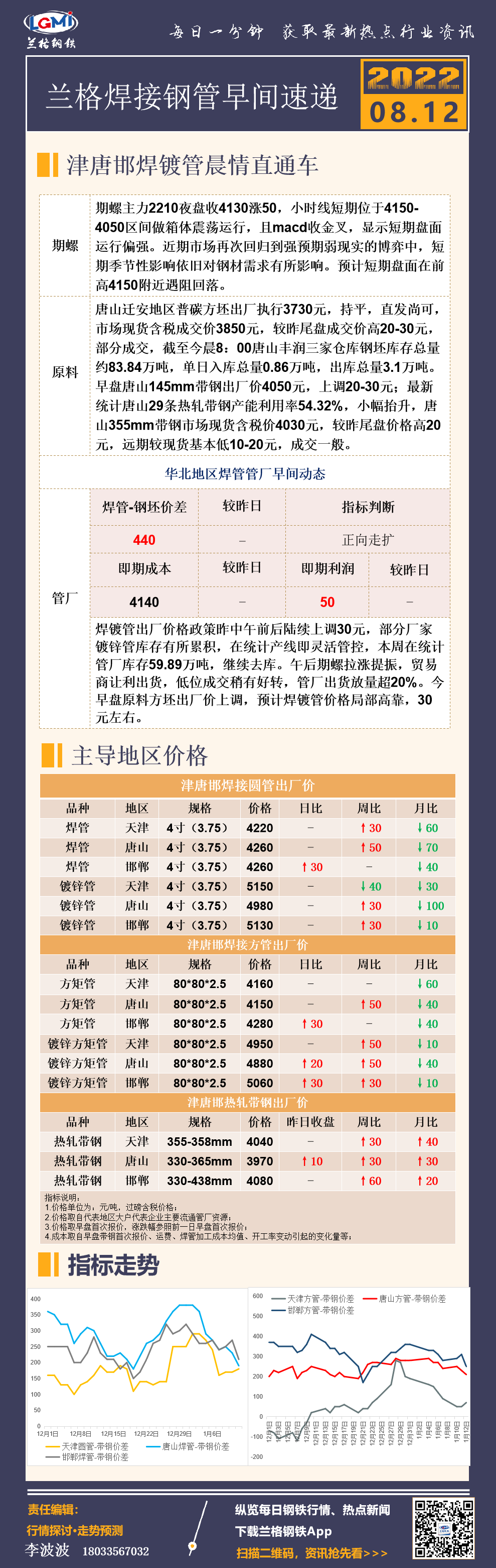 8月12日(9:20)兰格津唐邯焊接钢管早间速递