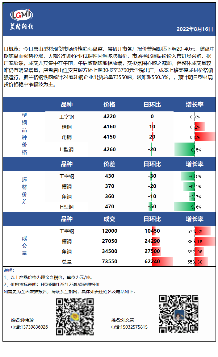 - 收评:今日唐山型材价格震荡运行,需求端询盘活跃,今日成交显著增量2022/8/16