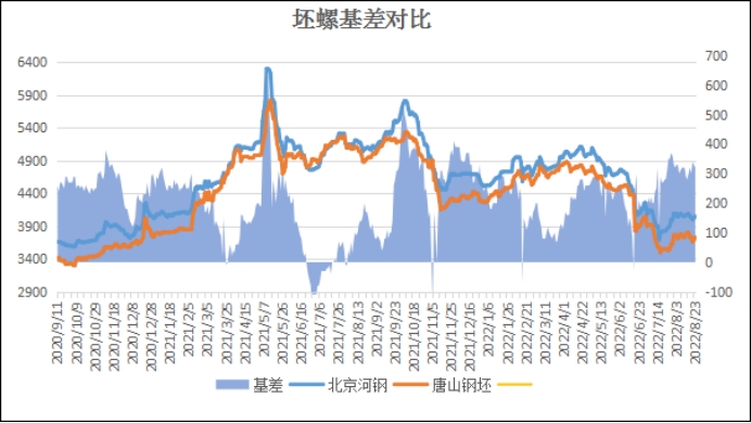 坯螺价差:以北京市场为例,8月23日河钢螺纹基价4050元与钢坯3730元基差为320元,较上个交易日收窄10元。