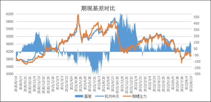 期现基差:以杭州市场为例,8月23日中天螺纹基价4160元与主力期螺收盘4052元基差为108元,较上个交易日收窄22元。