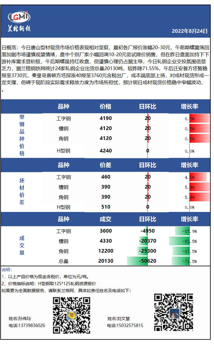 - 收评:今日唐山型材价格偏强运行,下游询盘冷清,成交清淡2022/8/24