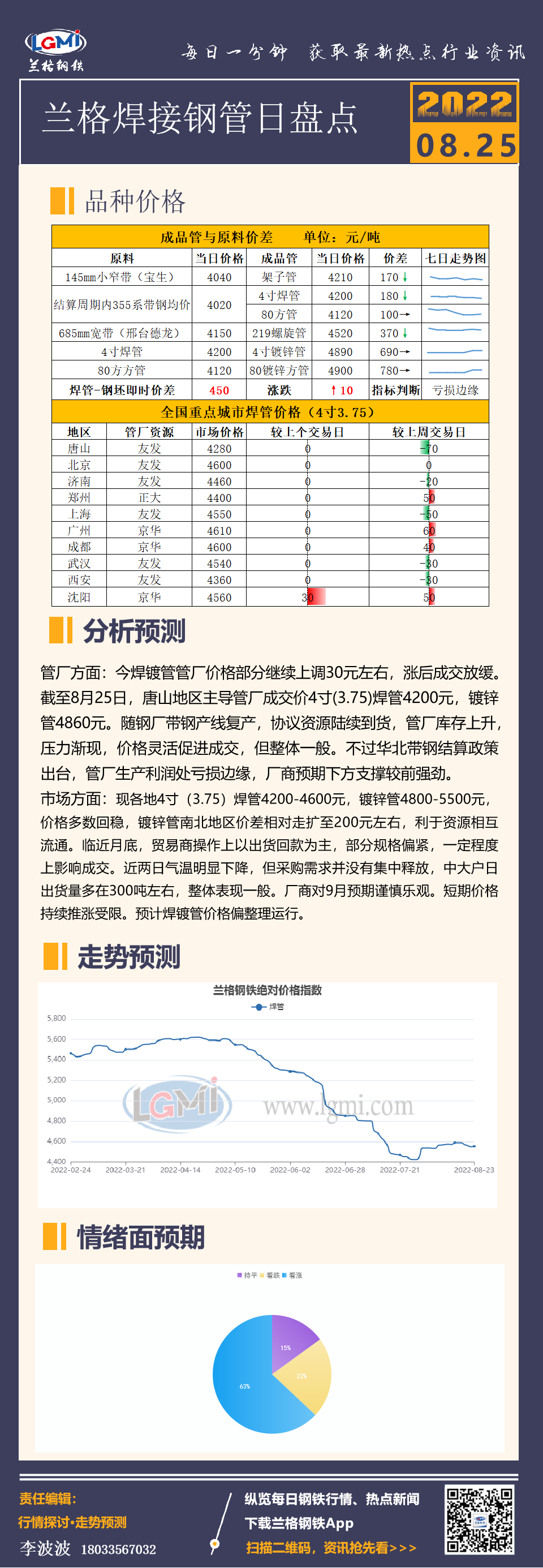 - 兰格焊管日盘点:成本继续推涨 需求增量不足 价格灵活2022/8/24