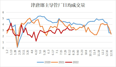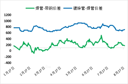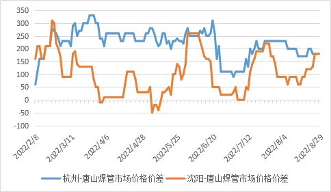 8月在统计高炉开工率小幅抬升。8月28日,兰格钢铁网统计全国主要钢铁企业高炉按容积计算开工率78.74%,较上月末上升3.41个百分点,月度平均开工率较上月下降0.11个百分点。其中8月唐山在统计热轧带钢产线平均产能利用率54.34%,环比下降7.79个百分点。长流程高炉铁水恢复,短流程因限电影响生产。不过,月内冷轧基料、带钢和热卷之间价差仍然偏窄,可替代性较强。管厂操作倾向谨慎乐观,多需求驱动排产,短期供应增势缓和。