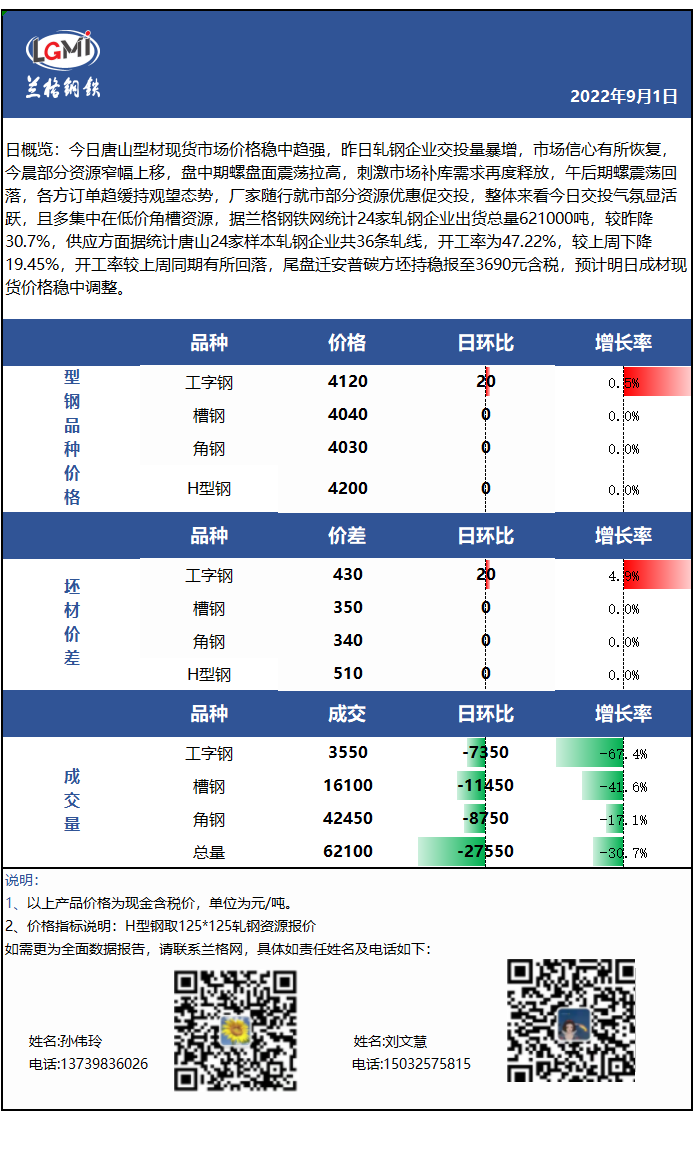 - 收评:今日唐山型材价格主稳趋强,终端需求仍有释放空间,成交尚可2022/9/1
