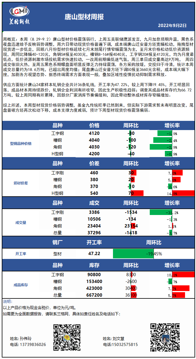 - 唐山型材周盘点:价格周同比降幅40-120元 低价资源交投放量2022/9/2