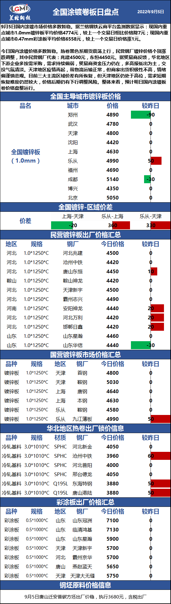 - 9月5日全国钢厂建筑钢材调价汇总2022/9/5