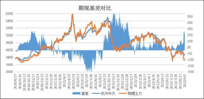 期现基差:以杭州市场为例,9月5日中天螺纹基价3960元与主力期螺收盘3691元基差为269元,较上个交易日收窄14元。