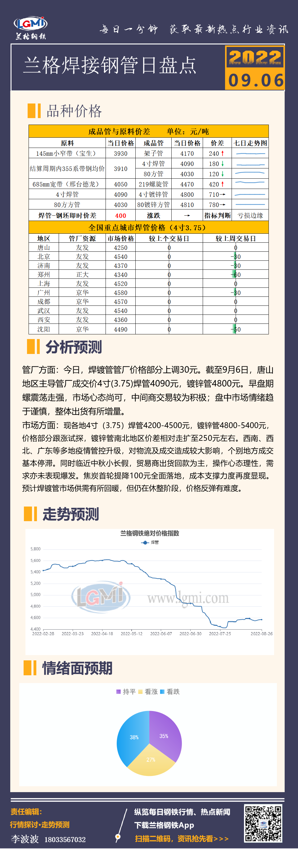 - 兰格焊管日盘点: 期货向上 现货企稳回涨2022/9/5