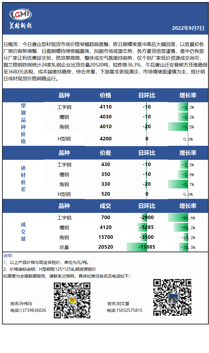 - 唐山型材日盘点:价格窄幅下行盘整 市场交投氛围维持弱势2022/9/7