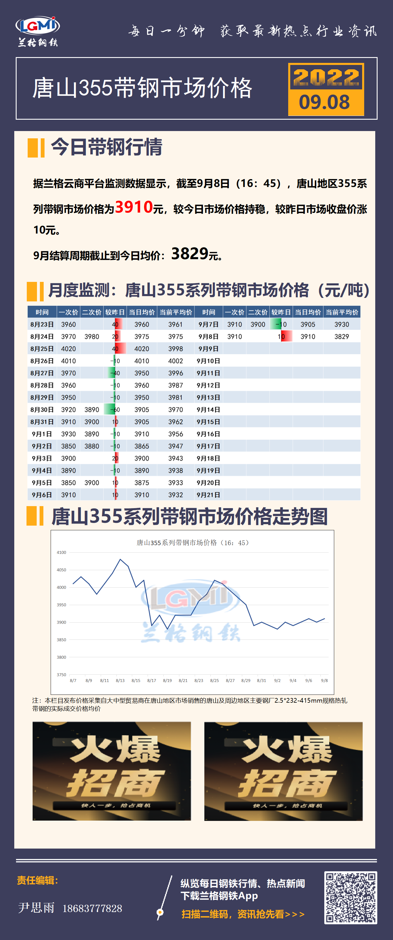 - 调价:9月8日唐山带钢宝生136-242系出厂价格再涨10元2022/9/8