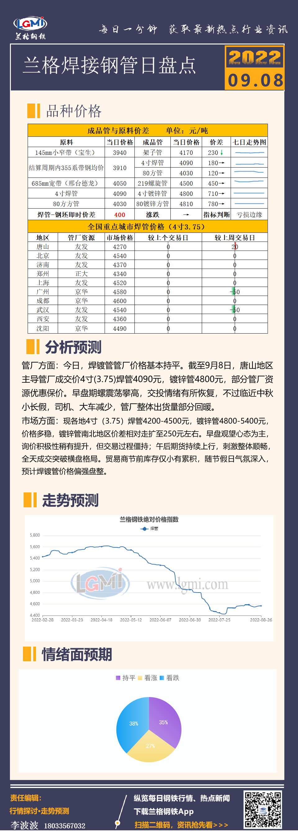- 兰格焊管日盘点:期螺顽强上攻压力位 现货量价回升2022/9/8