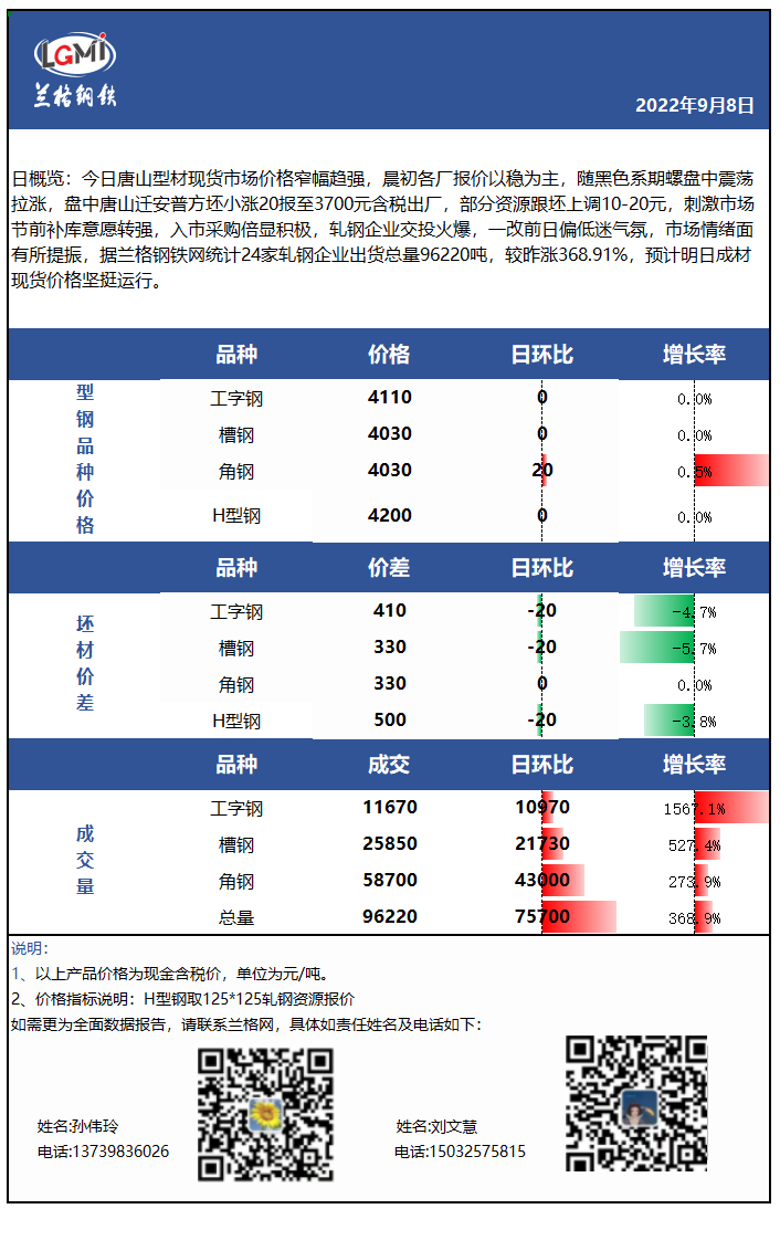 - 收评:今日唐山型材价格主稳趋强,市场交投氛围活跃,成交量暴增2022/9/8