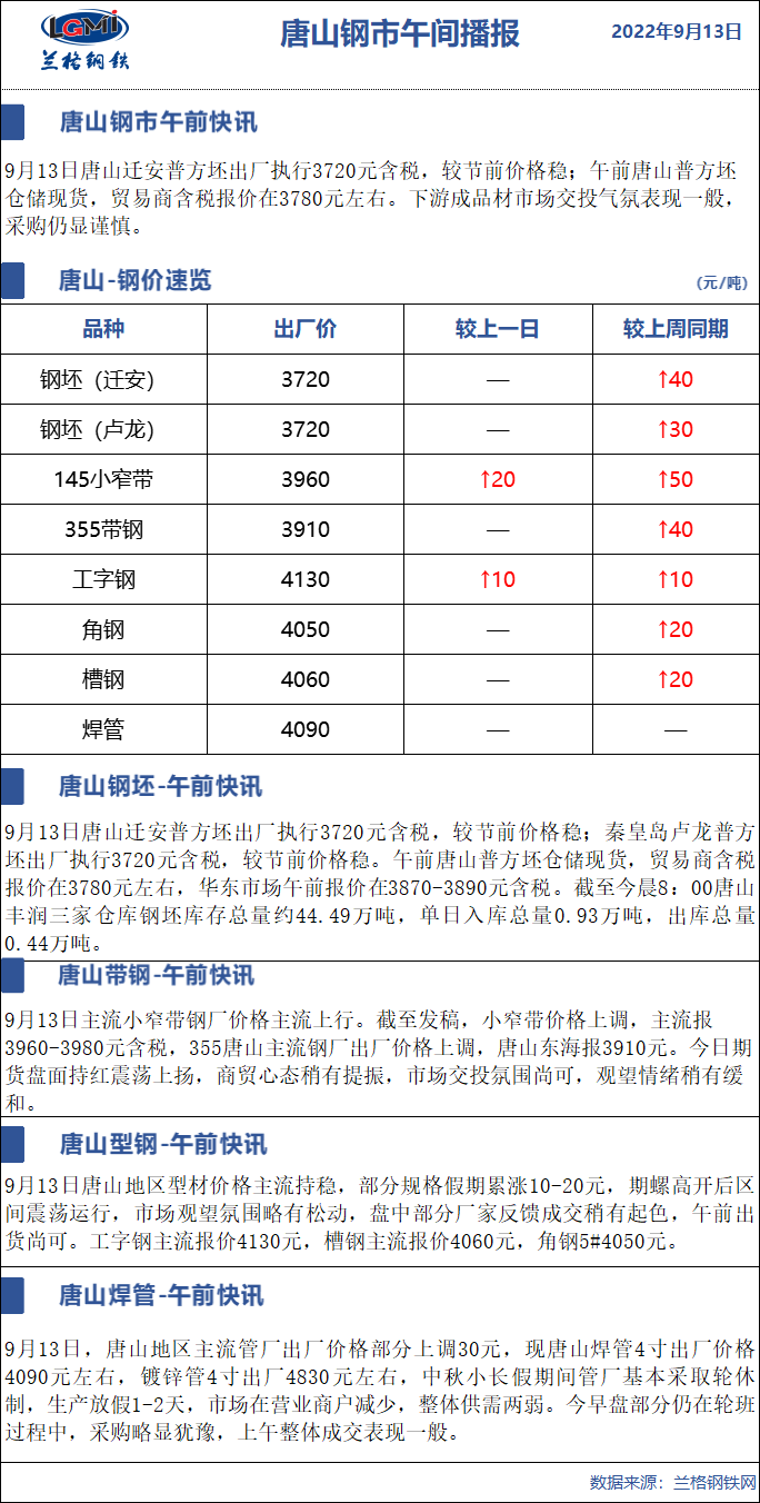 9月13日兰格唐山钢市午间播报