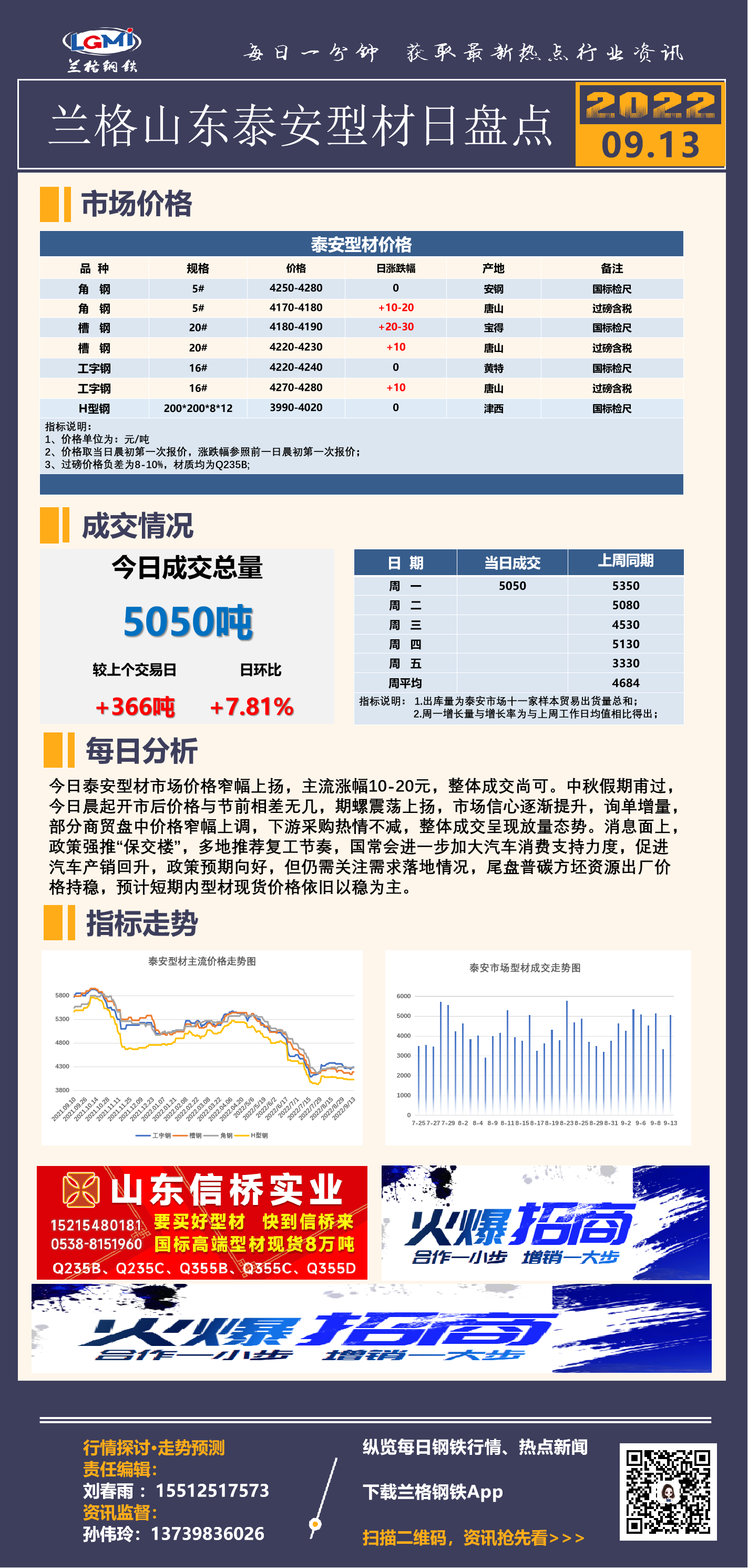 - 泰安型材日盘点: 价格上浮 期螺震荡上扬 成交放量2022/9/13