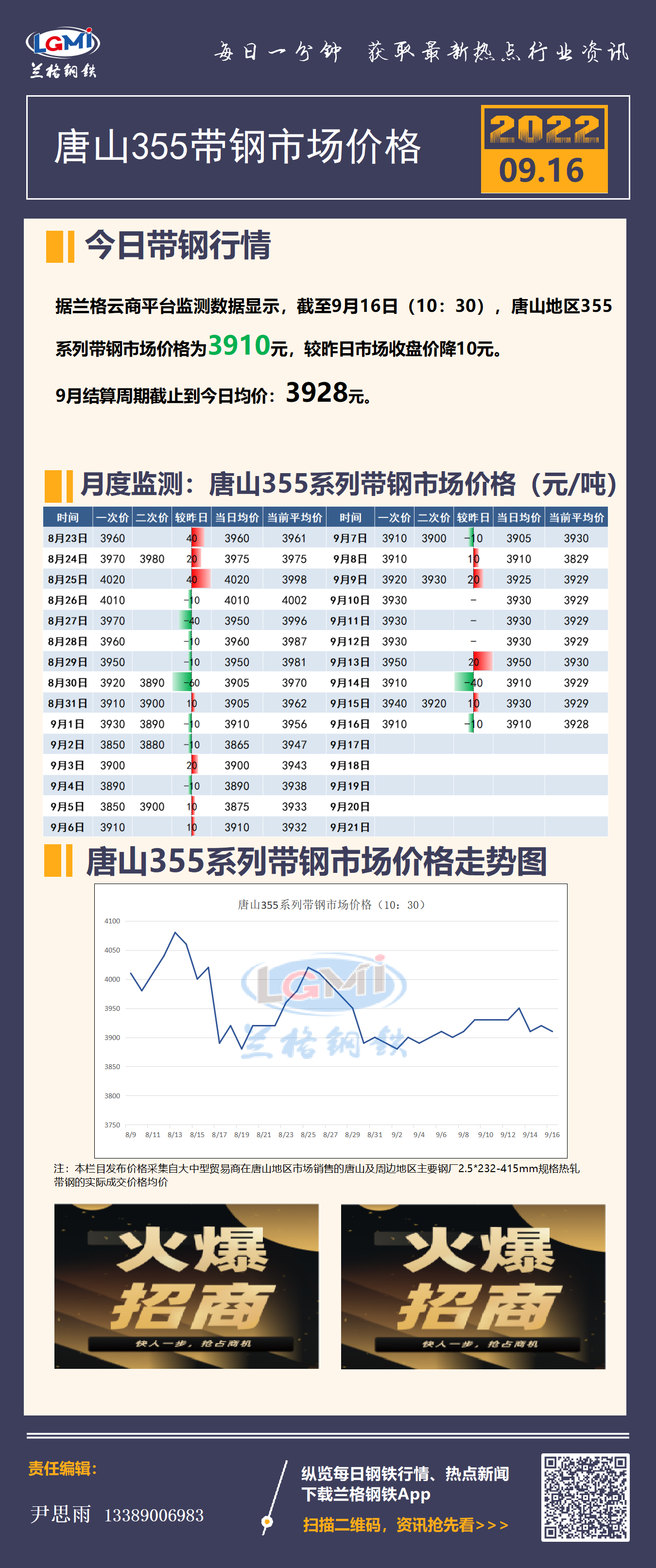 - 调价:9月16日唐山带钢经安145-162系出厂价格再降20元2022/9/16