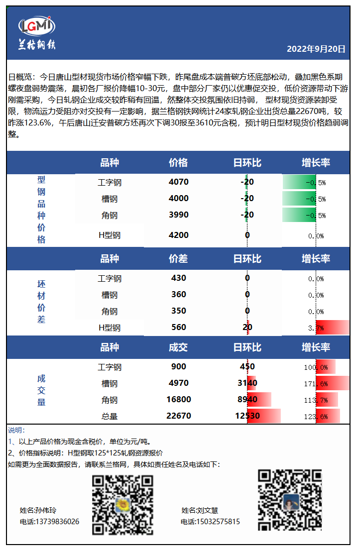 - 收评:今日唐山型材价格偏弱运行,需求端按需采购,出货平平2022/9/20