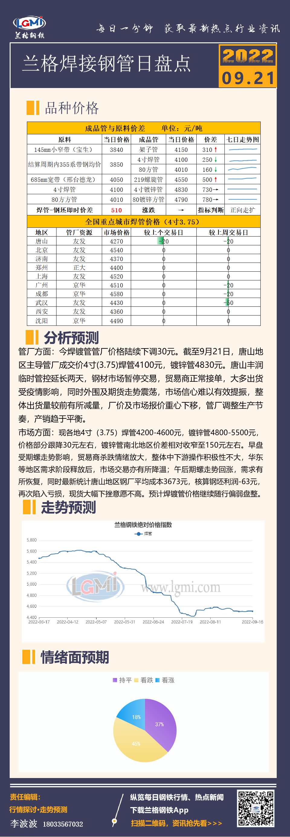 - 兰格焊管日盘点:价格多偏弱调整 成交午后有所恢复2022/9/21