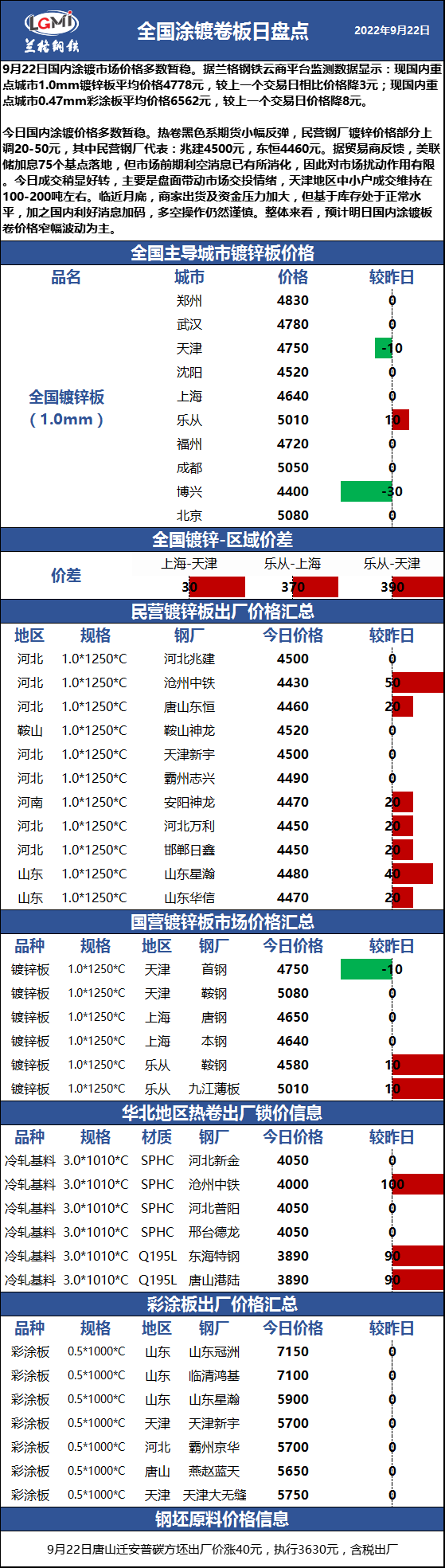 - 9月22日全国钢厂建筑钢材调价汇总2022/9/22