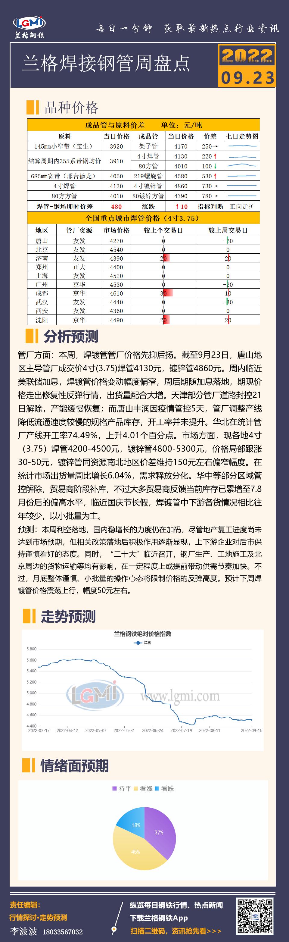 - 兰格焊管周盘点:利空落地 供需快速走旺 预期谨慎乐观2022/9/23